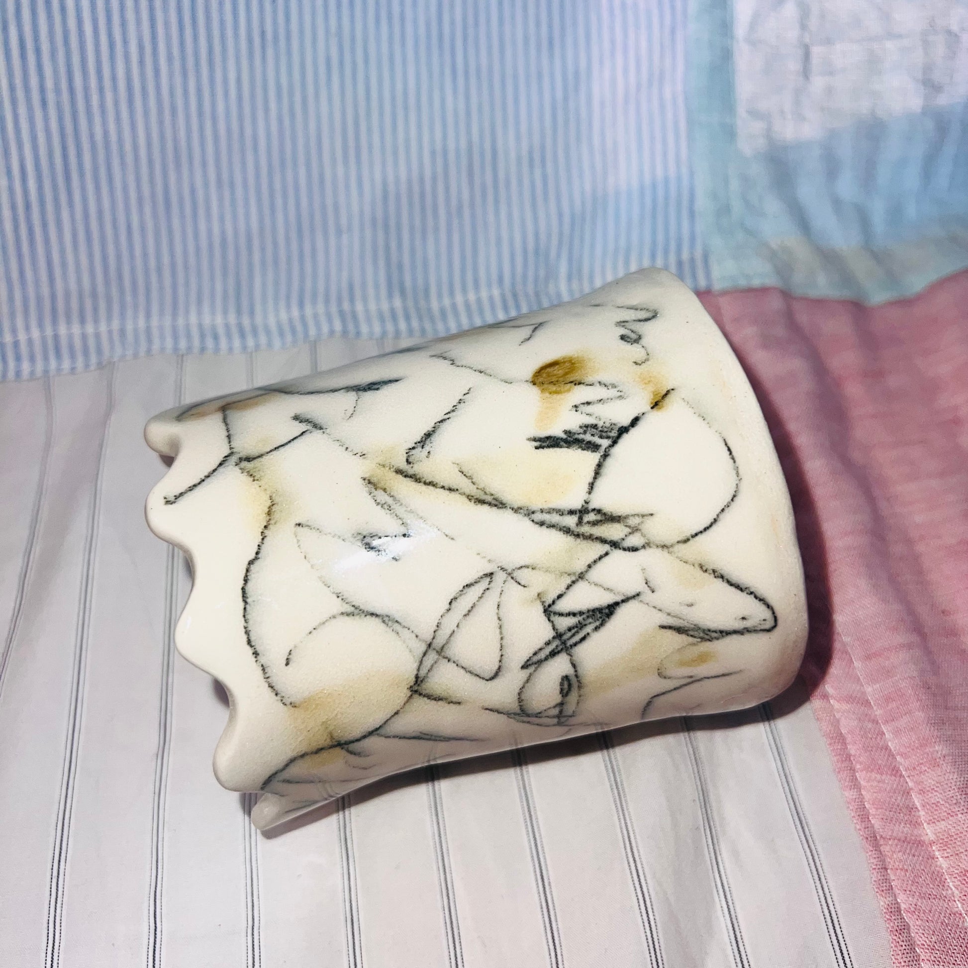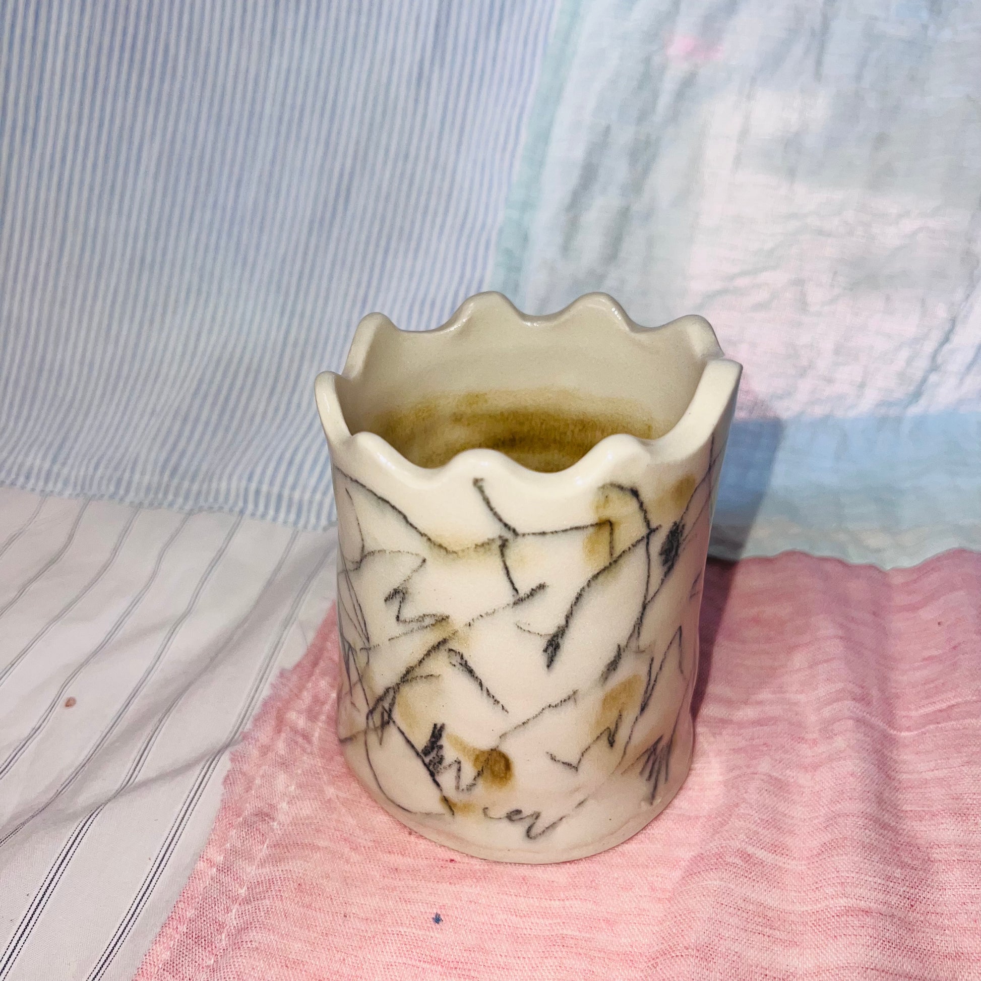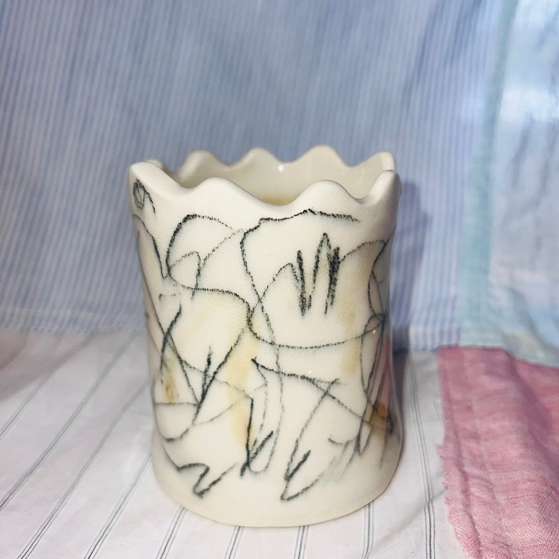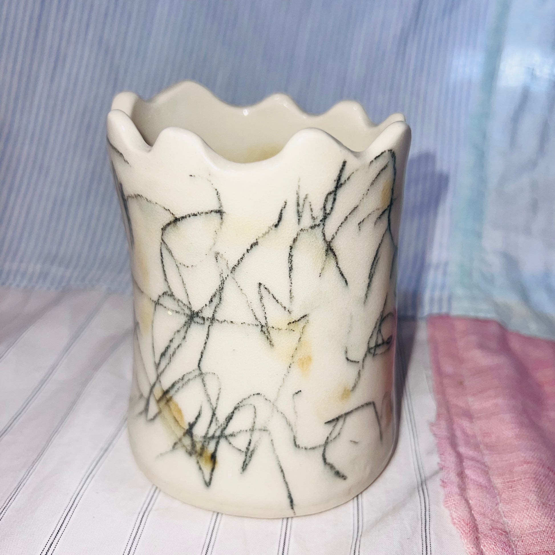 i'm a scribbly vase that looks like the castle on a chess board.